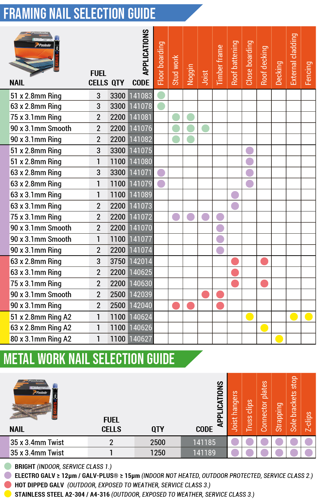 105 Joules of power, able to drive 51 – 90mm framing nails as well as hardened twist nails.